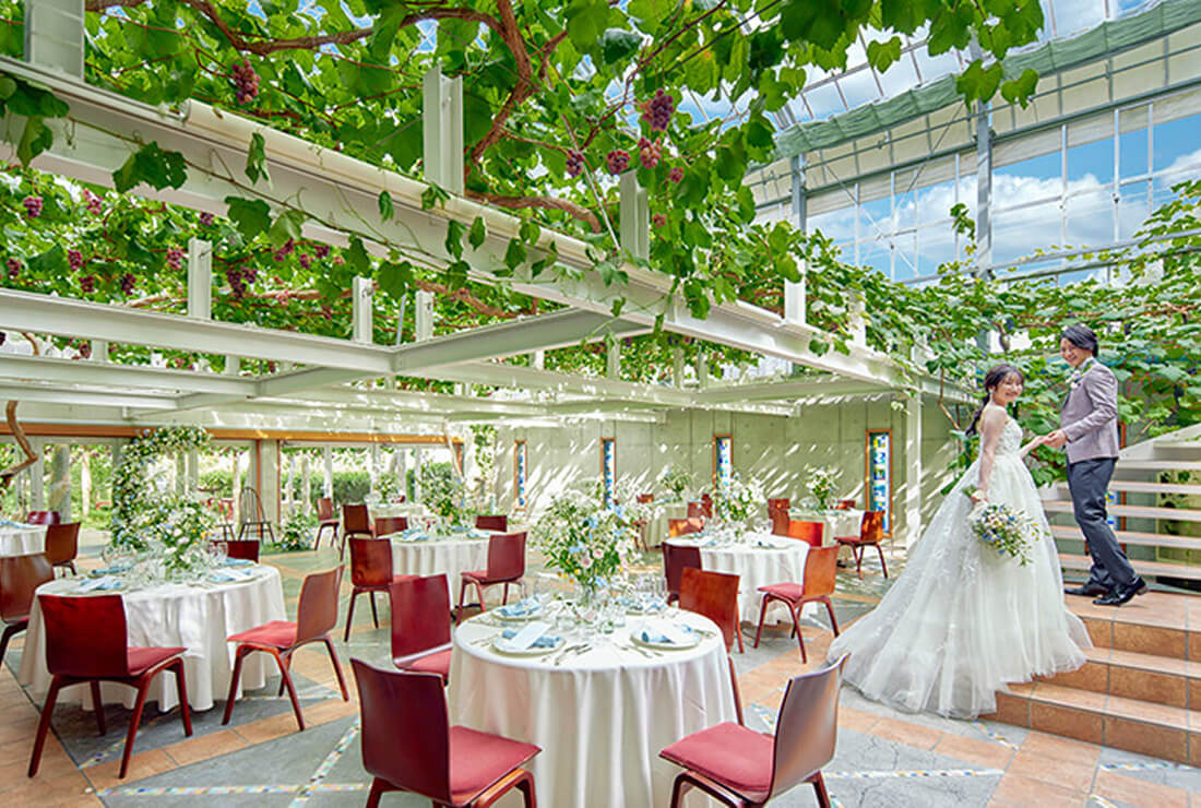 扉を開けると天井に広がるのは緑豊かなぶどう棚。全国でも珍しい屋内型のため雨天時も安心です。清々しい大自然の中で深呼吸をしているような気持ちの良いひとときを過ごすことができます。