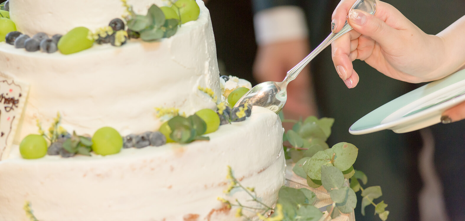 一生に一度の大切なセレモニーシーンを彩るウエディングケーキは、もちろんぶどうの森のケーキ。