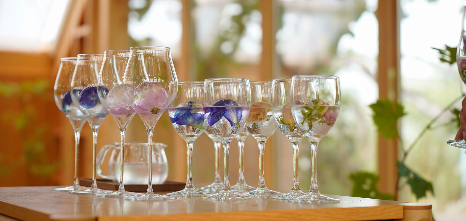 オリジナルドリンク収穫したぶどうを自社工場で丁寧に仕上げた100%ぶどうジュースや、ぶどうの森蒸留所で作られる【森のジン】白山の森の木々、世界各地の厳選されたスパイス&ボタニカルをブレンドして香り高く仕上げお料理をより華やかに彩ります。
