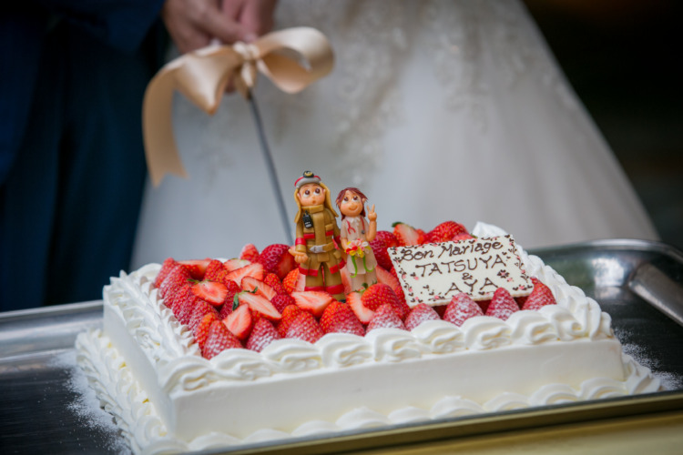 披露宴は親族の仲が深まるよう、それぞれの自己紹介や、くじ引きを使ったサンクスバイトをしたり、本日のラッキーさんにぶどうの木のぶどうをプレゼントしたりと工夫しました! ウェディングケーキの上に、2人の仕事にスポットをあてたかわいいマジパンをのせてもらいました!