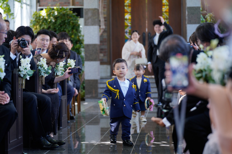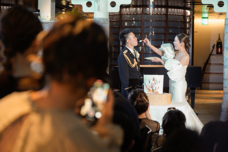 ゲストがゆっくり楽しめるような時間にしたかったので余興はせず歓談や写真を撮る時間を増やしました。ゲストが参加できるようにと考えていたところ、担当プランナーさんからぶどうカットし、ゲストへプレゼントする提案があり、当日は大盛り上がりでした。リングボーイガールの衣装や席札、招待状、ムービーなど手作りのものも増やしました。