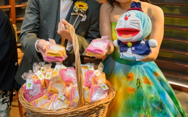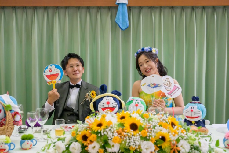 1番のテーマは【感謝を伝えること】だったので、ゲストに喜んでもらえるように、人前式をはじめゲスト参加型となるよう試行錯誤しました。 もう1つの大切なテーマとして、ふたりとも【ドラえもん】が大好きなので、ゲストがドラえもん達と一緒にぶどうの森で楽しく過ごす時間をイメージして小物やウェディングケーキやBGM等演出を準備しました。 自分達も楽しむけれど、ふたりよがりにはならないよう、ふたりであれこれ意見を出しながら準備した時間も今でも大切な思い出です。