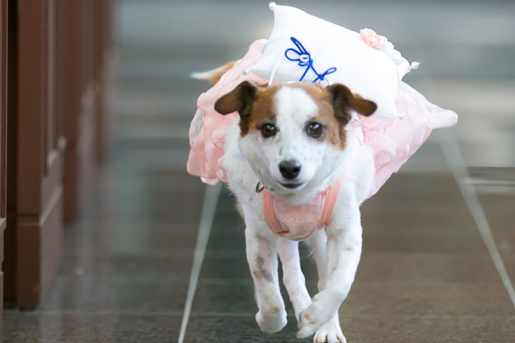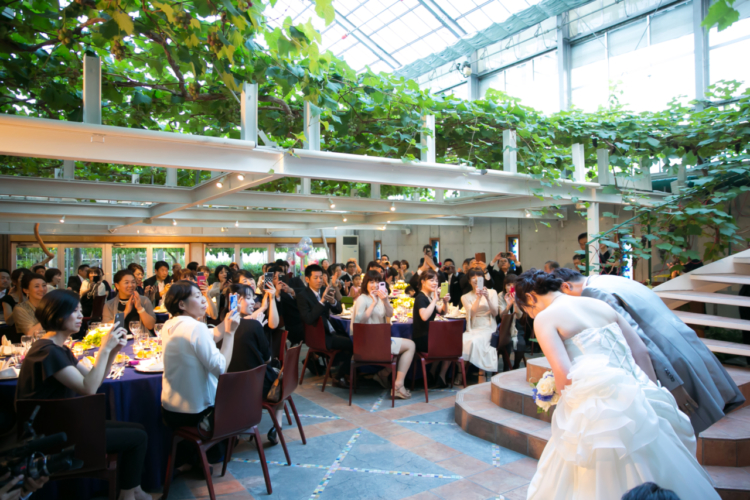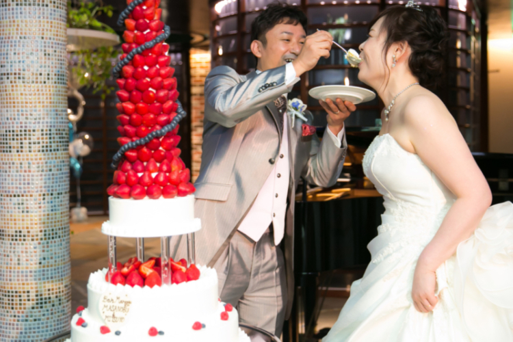ゲストの皆様にあまり負担にならないようにと会費制に。 また、披露宴での演出は少なくし、大切なゲストの皆様と肩ひじ張らずにゆったりと楽しめる歓談中心のパーティーにしました。 ウエディングケーキはずっと気になっていた“苺のクロカンブッシュ”を。 大きくて豪華で、登場シーンは盛り上がりました。 挙式はゲストの皆様に参加して頂いてブーケセレモニーをしたり、絶対にやりたかったリングドッグを行ったり…と、皆さんに楽しんでもらえるような内容にしました。