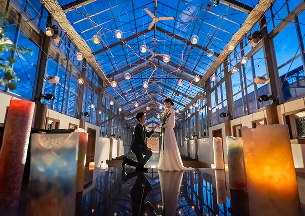 陽が暮れるにつれてキャンドルの幻想的な光がチャペルを包み込み、幻想的な空間が2人の門出をお祝いしてくれます。