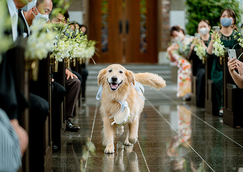 挙式会場はペットも同伴可能。リングドッグや承認のサイン(肉球スタンプ)などペットならではの演出を取り入れることでオリジナルティあふれ、温かい雰囲気の結婚式に。