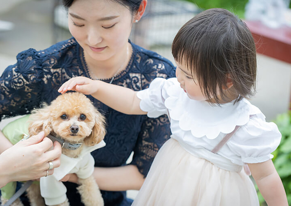 家族の一員でもある、愛するペットと大切な瞬間を家族で分かち合うことができ、ペットにとっても過ごしやすい自然豊かな会場でご希望が叶います。